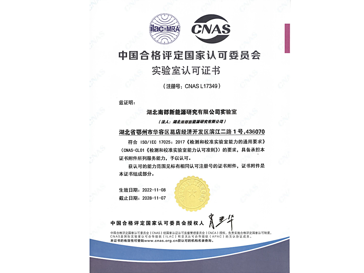 日前,湖北新宝gg创造奇迹新能源研究有限公司(简称“湖北研究院”),正式通过中国及格评定国家认可委员会(CNAS)的认可,荣获CNAS实验室认可证书(注册号:CNAS L 17349)。